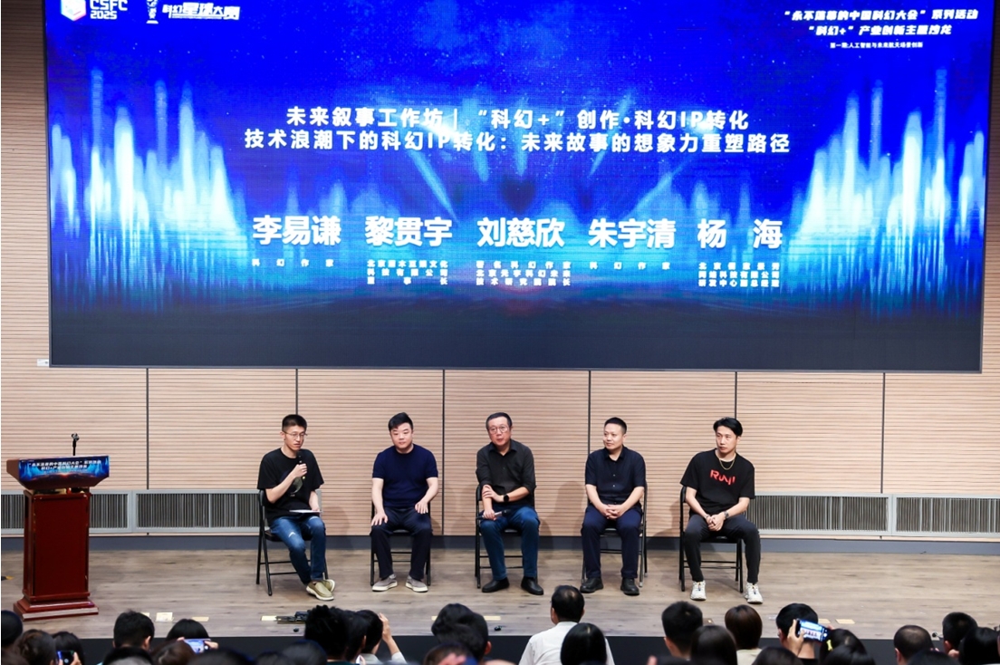 会上还举行了“技术浪潮下的科幻IP转化:未来故事的想象力重塑路径“圆桌论坛,科幻作家朱宇清、北京灌木互娱文化科技有限公司董事长黎贯宇、北京儒意景秀网络科技有限公司研发中心副总经理杨海与刘慈欣一起,围绕科幻文学创作和IP转化等内容,进行深入探讨。本场圆桌由科幻作家李易谦主持。大家认为科幻让文学创作,故事想象,更富有深度和广度,科幻是未来的文学,也是现实的文学。