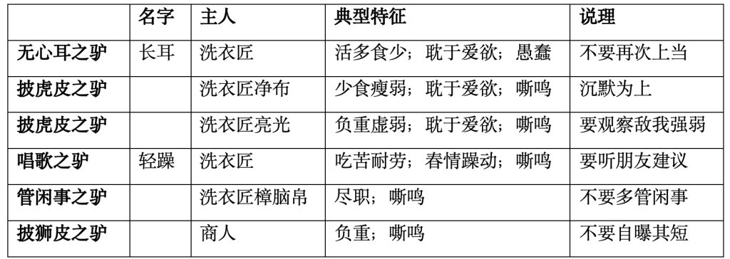 《伊索寓言》中有十几个关于驴的故事,在内容的丰富性上远胜印度,驴的形象也更加多元。其中,一个情节类似的故事是“驴和狮子皮”:驴披上狮皮吓唬众兽,狐狸因听过其叫声而看破其身份。其余有关驴的故事大体可分为数类: