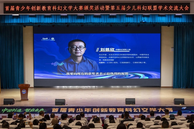 中国创造,智启未来。7月27日,全国首届青少年创新教育科幻文学大赛颁奖活动暨第五届少儿科幻联盟学术交流大会在重庆巴蜀科学城中学校举行。重庆政协原副主席陈万志,重庆作协原主席黄济人,重庆市教委二级巡视员蔡理,西部科学城重庆高新区党工委委员、管委会副主任王松光,重庆市作协党组成员、秘书长赵崇斌,重庆市关工委副主任、重庆市青少年作家协会主席帅逊,重庆市关工委副主任韩国涛,重庆市作家协会组联部主任陈飞,西部科学城重庆高新区公共服务工委书记、公共服务局局长周文杨,重庆市作家协会诗歌创委会主任、重庆市青少年作家协会常务副主席王顺彬,重庆市青少年作家协会副主席兼秘书长吴黎,重庆巴蜀科学城中学校党委书记赵文平等与会。科幻作家刘慈欣、王晋康发来祝贺视频。科幻艺术家、国际“雨果奖”最佳职业艺术家奖获得者赵恩哲,科幻作家宝树、贾煜、萧星寒、陆杨、超侠、周洲、何明瀚,《未来少年派》杂志执行主编刘婧,科幻教育专家兰莉等,以及来自全国各地的数十名出版人、教育专家,包含获奖者在内的数百名师生及家长参加颁奖活动。