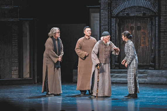 在天桥艺术中心上演的国话版《四世同堂》剧照,左起分别为钱默吟、祁 瑞 宣、祁 老人、韵梅。周毅然 房媛媛摄影