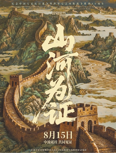 8月15日,由华夏电影发行有限责任公司和中央新闻纪录电影制片厂(集团)制作的首部全景式展现中国人民14年抗战艰辛历程的纪录电影《山河为证》隆重献映。80年前的这一天,日本宣布无条件投降,中国人民历经14年不屈不挠的浴血奋战,终于迎来了胜利。立足于对抗战历史更为深刻、更加全面的认知,《山河为证》将“十四年抗战”作为中国抗战历史的完整叙述,通过真实的影像与史料,清晰而完整地还原从1931年九一八事变到1945年抗战胜利的历史全貌,系统地将局部抗战与全民族抗战联结起来,呈现在观众面前。