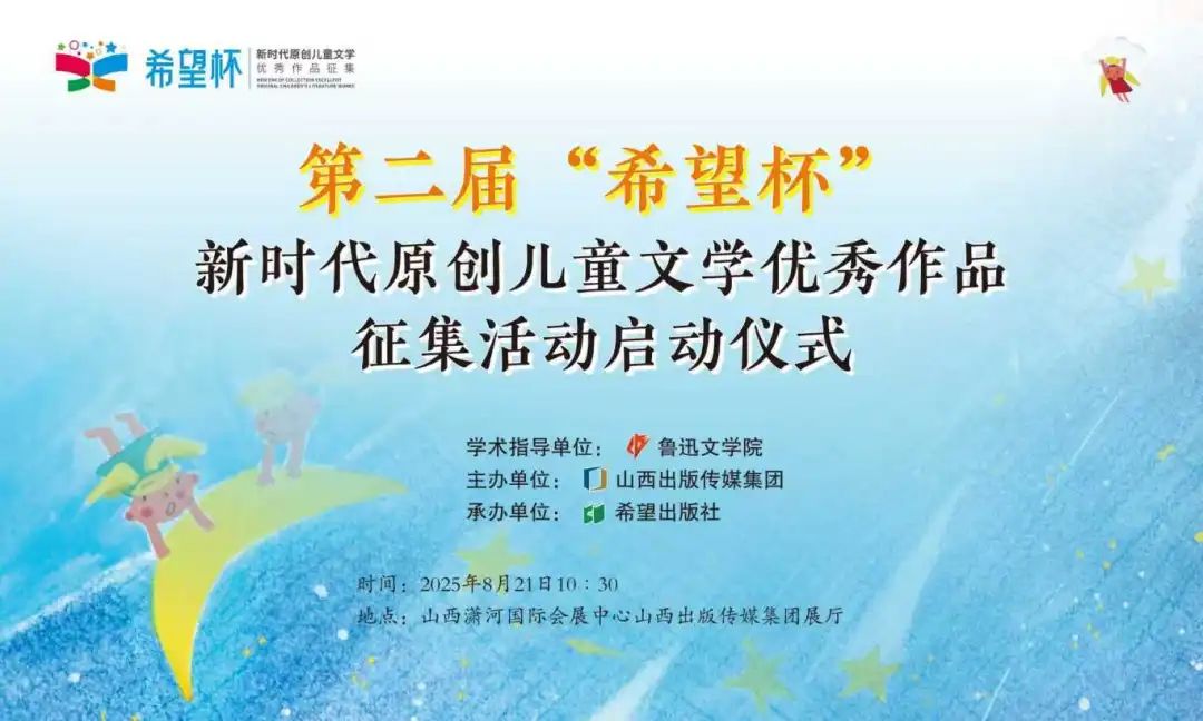 8月21日上午,由鲁迅文学院担任学术指导,山西出版传媒集团主办、希望出版社承办的第二届“希望杯”新时代原创儿童文学优秀作品征集活动启动仪式,在山西潇河国际会展中心山西出版传媒集团展厅隆重举行。本次活动以习近平新时代中国特色社会主义思想为指导,深入贯彻落实习近平文化思想,紧扣党的二十大关于文化建设的战略部署,围绕建设社会主义文化强国的目标,围绕“与时代呼应 为儿童创作”的核心主题,旨在进一步推动原创儿童文学高质量发展,鼓励创作者书写新时代少年儿童的生活与精神世界,讲好中国故事,切实承担“举旗帜、聚民心、育新人、兴文化、展形象”的使命任务。