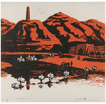 古安村:1991年底,古元被确诊为癌症晚期。20世纪90年代,古元不仅创作了一批黄河题材作品,还创作了一批骆驼题材作品。实际上,这些创作都是他在术后对人生和自我的重新审视。人生既有美好安静的顺流,也有异常艰难的逆流、漩涡和浅滩。在创作《激流勇进》时,古元已历经四次化疗,身体极度虚弱。然而,他以顽强的意志力坚持创作,通过描绘黄河漩涡与逆流而上的纤夫等意象,艺术化地传达了其战胜病魔的精神信念。此时,他还创作了《西出阳关》等骆驼题材作品,刻画了驼队在荒漠风沙中艰难跋涉的视觉意象,同样呈现出古元强烈的精神诉求。骆驼题材作品与黄河题材作品彼此呼应,共同体现了古元晚期创作中的生命哲学思考。骆驼坚韧前行的精神、黄河激流勇进的精神,不仅体现了古元个人的生命哲学思考,也升华为对民族精神与抗战记忆的艺术诠释。