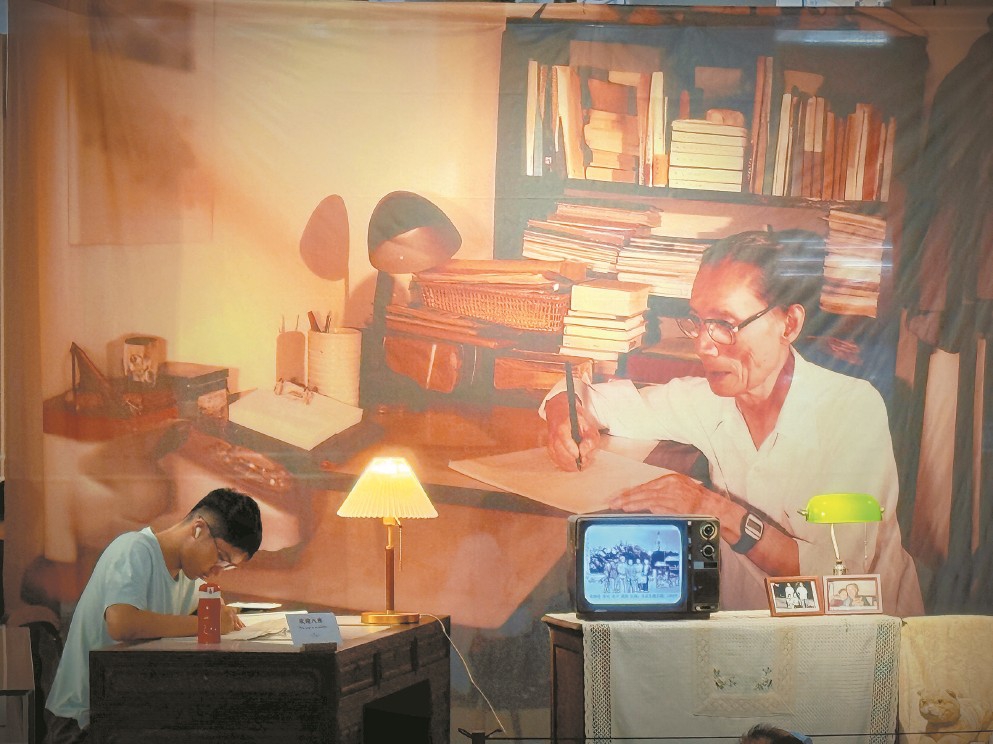 上图东馆手稿主题馆展览现场,小读者在主视觉区的仿真书桌与夏衍“对坐”。