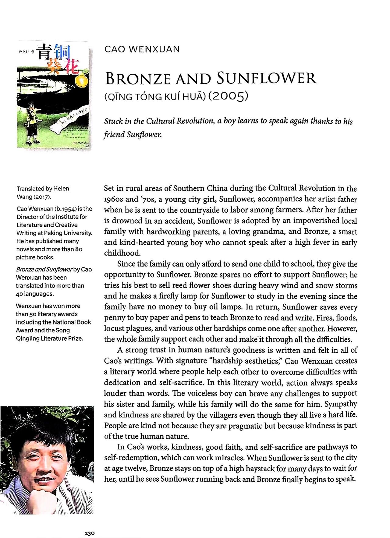 出版于2005年的《青铜葵花》讲述了中国乡村特殊年代下农村男孩青铜与城市女孩葵花之间诚挚纯真的兄妹情谊,饱含着“诗意的苦难”与人性的温情,《奇迹的世界》中该词条的撰写者徐德荣教授这样概括道:“在曹文轩的作品中,善良、诚信与自我牺牲是通往自我救赎的途径,能够创造奇迹。”二十年过去了,这份来自中国的“奇迹”正在世界范围内抚慰着越来越多的孩子,截至2025年8月,作品已被译为26种语言,出版36个版本,从英,法,德,日,意大利语、阿拉伯语等各大语种,到斯瓦希里文、僧伽罗文等,全世界的孩子正在被芦花鞋和冰项链的故事所深深感动着。