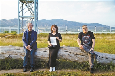 评论家孟繁华(左一)、兴安(右一)与《草原十二骑手》 主编阿霞(中)在敕勒川草原为新刊拍片