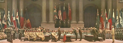 正在中国美术馆举办的“人民必胜——纪念中国人民抗日战争暨世界反法西斯战争胜利80周年美术作品展”中,陈坚的油画作品《公元一千九百四十五年九月九日九时》,描绘了1945年9月9日9时在南京中国陆军总部举行的日军投降仪式,再现了中国战区受降的历史场景。
