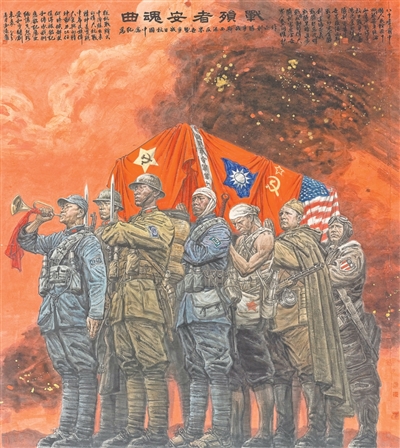 对于画作命名,我也想了很多,但都不太满意。直到有一天,我受冼星海《黄河大合唱》、贝多芬《英雄交响曲》启发,将画作命名为《战殒者安魂曲》——“战殒者”指所有在抗战中牺牲的人们。这既是对民族苦难的回望,更是面向国际社会的呼吁,希望各国以史为鉴,共促和平发展,共创人类更加美好的未来。
