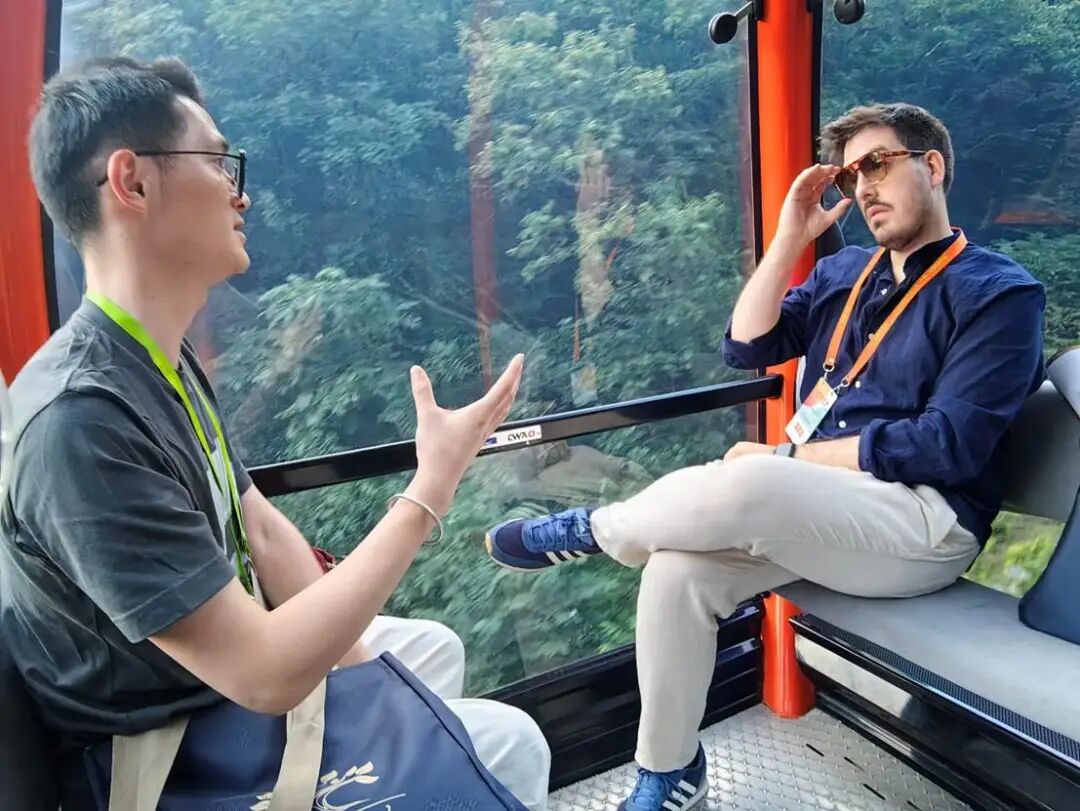 乘坐缆车期间,活动志愿者冯凌锋为阿根廷诗人马克西米利亚诺·莱尼亚尼讲解中国文化。陈泽宇 摄。