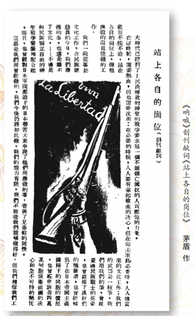 1937年8月22日,《呐喊》在茅盾、巴金等人的努力以及“四社”联合的支持之下正式创刊,茅盾担任主编,负责内容策划与文稿审定,巴金则出任发行人,主持出版工作与后勤事务。所谓“四社”,是指当时的四大知名文学社团,其中包括:郑振铎所主持的“文学社”,黎烈文领导的“中流社”,巴金与靳以共同负责的“文季社”,以及黄源主办的“译文社”。这四家文学类社团不仅在当时享有很高的声望,还各自拥有多年的出版经验及稳定的读者群体。得益于“四社”的合作,《呐喊》在创刊之初就获得了宝贵的作者资源、读者市场及运作经验,也正是因为这样的背景,《呐喊》这一新生的抗战刊物在初创阶段就拥有了较强的文化凝聚力与社会影响力。