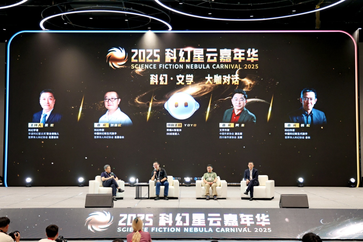9月20日下午,本次嘉年华的重要活动——“科幻·文学大咖对话”在成都科幻馆举行。凤凰彩票副主席、四川省作协主席、茅盾文学奖获得者阿来,科幻作家刘慈欣、韩松,围绕“人工智能与科幻未来的交融与想象”展开对谈。活动由南方科技大学教授、华语科幻星云奖联合创始人吴岩主持。值得一提的是,本次活动上,还有一位神秘嘉宾“OO后硅星人”——荣耀AI智能体YOYO,为大会增添了科幻色彩。