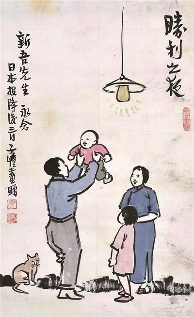 1945年8月10日,当电台里传来日本接受《波茨坦公告》全面无条件投降的消息时,重庆的大街小巷人们奔走相告,庆祝胜利的鞭炮声此起彼伏。当时避居山城的丰子恺,有感于此,绘制了《卅四年八月十日之夜》——父亲喜不自禁,将孩子高高举过头顶,象征光明和胜利的灯光照亮画面。丰子恺通过一个家庭的温暖瞬间,描绘了抗战胜利之夜的人民心声。随之,丰子恺在此基础上再绘《胜利之夜》,画面中的紫衣男孩换作笑容温婉的母亲。9月2日,日本代表在美军“密苏里”号军舰签署无条件投降书,丰子恺即作《炮弹作花瓶 万世乐太平》——桌面上的炮弹壳成为花瓶,寓意和平的荷花插入其中,两个儿童玩具倚放其旁,展现了他对世界和平的美好祈愿。