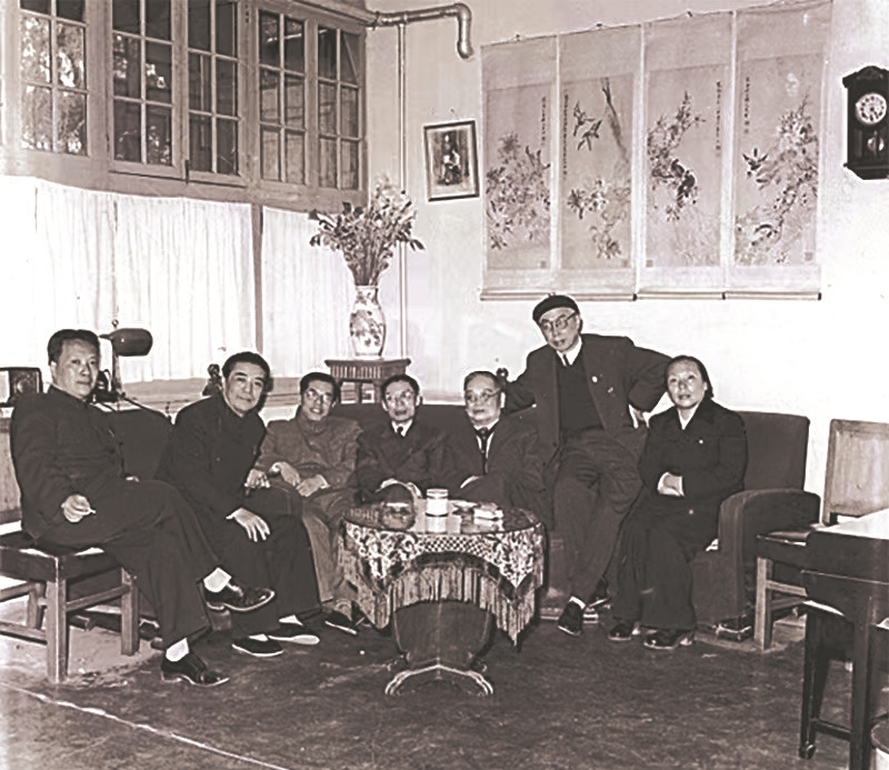 1960年,戏剧家们在北京张自忠路欧阳予倩家中,左起:陈白尘、阳翰笙、张庚、夏衍、欧阳予倩、田汉、李伯钊