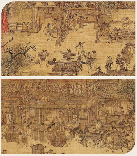 ??从《清明上河图》上可以清晰地看到,商人比比皆是,商品琳琅满目。汴河两岸店铺林立,街道上游人如织。穿过城门进入内城,更是一派热闹繁华光景。