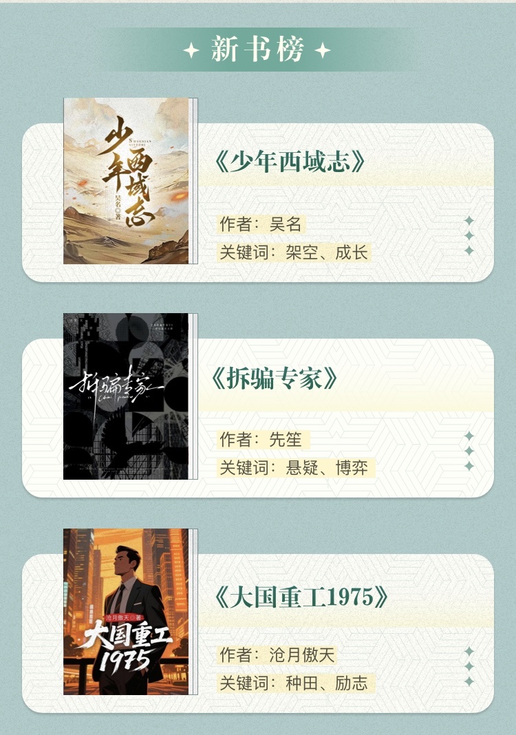 在新书榜中,三部新作对叙事与结构实现了新的创新与突破。《少年西域志》从独特的西域视角进行武侠创作,是武侠创作中少有的一次突破性类型融合实践。《拆骗专家》创新采用双视角叙事手法拓展刑侦文学的创作维度,以立体人物构建现实隐喻,深刻体现了网络文学直面现实、剖析人性的创作自觉。《大国重工1975》将“重生”叙事与工业史诗有机融合,不仅打破了网络文学“轻娱乐”的固有认知,更以民族记忆与时代发展为创作根基,为题材创新提供了兼具思想深度与文化厚度的实践范式。