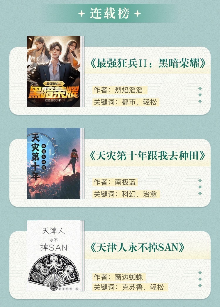 连载榜的三部作品,凭借新颖有趣的题材持续获得广泛关注。《最强狂兵Ⅱ:黑暗荣耀》作为经典男频网文《最强狂兵》的续作,延续前作构建的世界观,将家族复兴的主题与都市异能结合,并融入许多新兴势力,成功拓展了题材边界,为类型创作注入了新鲜活力。《天灾第十年跟我去种田》立足末日语境,主角夏青于文明倾覆十年后开启破局之旅——以农业为根基复苏生产力,以社群为纽带重建社会契约,在废墟之上践行人类文明的延续使命。《天津人永不掉SAN》以克苏鲁为题材,将西方恐怖叙事与天津地域文化成功结合,将克苏鲁风格实现了本土化改造。