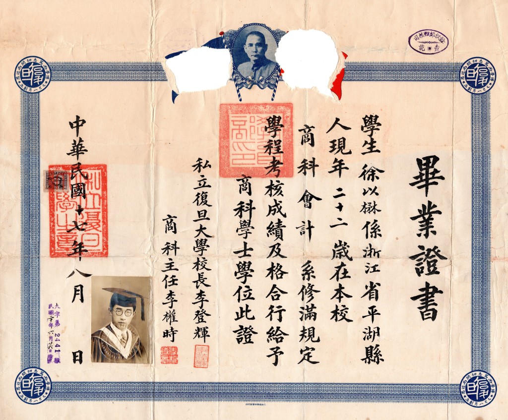 徐以楙1928年复旦大学毕业证书