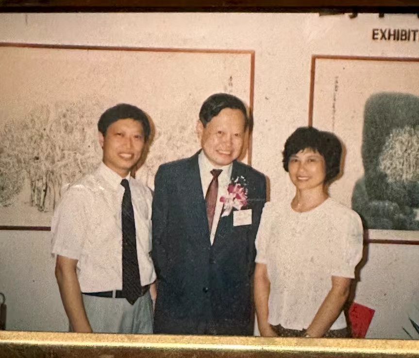 1991年杨振宁教授在香港心源画廊和沈津、沈太太赵宏梅合影