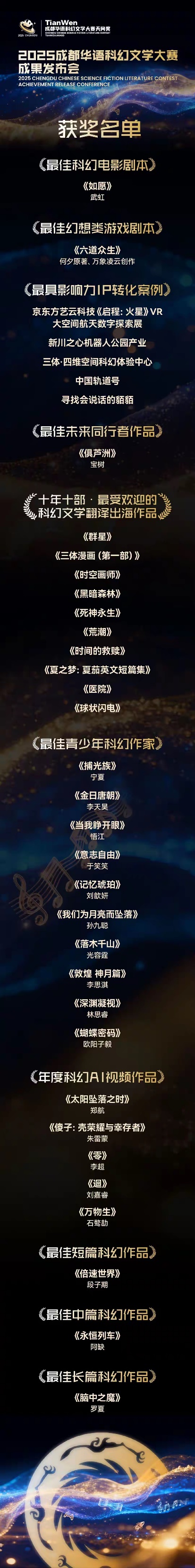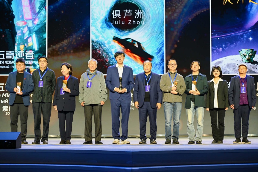 发布会上,颁发了十个单元类别的奖项,武虹《如愿》获最佳科幻电影剧本奖; 何夕原著、万象凌云创作的《六道众生》获最佳幻想类游戏剧本奖;京东方艺云科技的《启程:火星》VR大空间航天数字探索展获最具影响力IP转化案例;宝树《俱芦洲》获最佳未来同行者作品奖;《群星》《三体漫画(第一部)》《时空画师》《黑暗森林》《死神永生》《荒潮》《时间的救赎》《夏之梦:夏茄英文短篇集》《医院》《球状闪电》获“十年十部·最受欢迎的科幻文学翻译出海作品”奖;宁夏、李天昊、悟江、于笑笑、刘歆妍、孙九聪、光容霆、李思淇、林思睿、欧阳子毅获最佳青少年科幻作家奖;《太阳坠落之时》《傻子:壳荣耀与幸存者》《零》《迴》《万物生》获年度科幻AI视频作品奖;段子期《倍速世界》获最佳短篇科幻作品奖;阿缺《永恒列车》获最佳中篇科幻作品奖,罗夏《脑中之魔》获最佳长篇科幻作品奖。