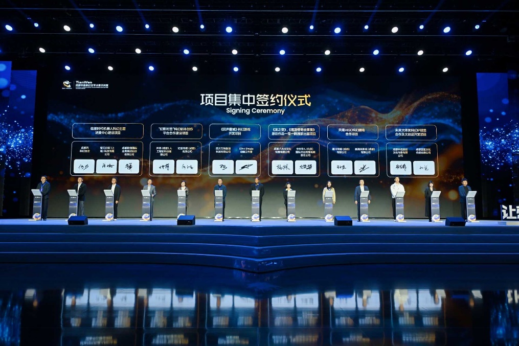 活动最后,还举行了硅基时代机器人科幻主题消费中心建设、“幻影时空”科幻剧本创作平台合作建设、《回声叠城》科幻游戏开发、《龙之变》《海漄怪奇作品集》原创作品一带一路国家出版、共建AIGC科幻剧场合作项目未来大师奖科幻IP视觉合作及文创品开发等6个项目签约仪式。