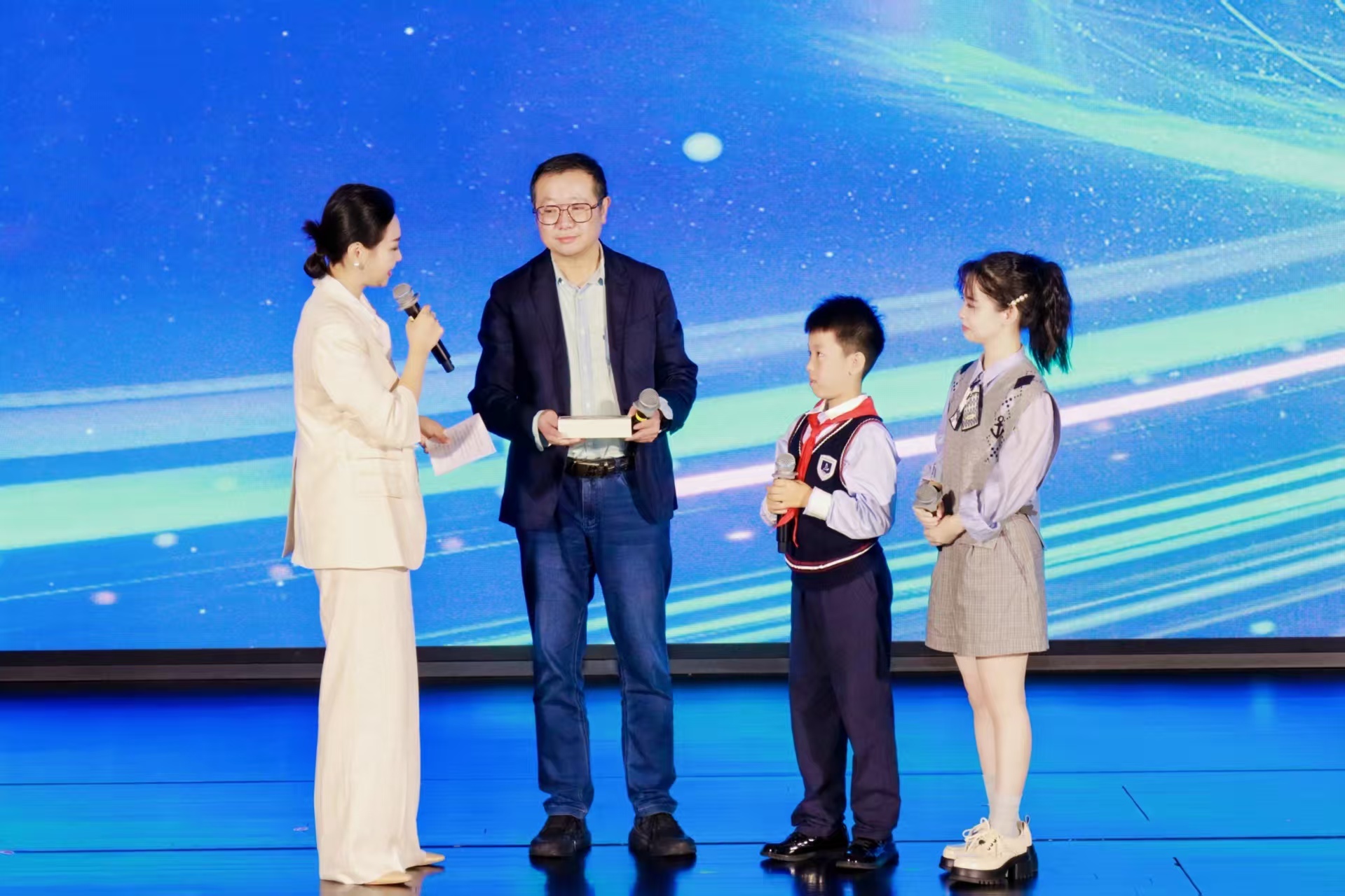 刘慈欣与到场读者进行了热烈的互动交流,与小读者互赠礼物,现场还播放了读者使用AI制作的刘慈欣作品视频,昆山大学的学生演绎了科幻短剧。