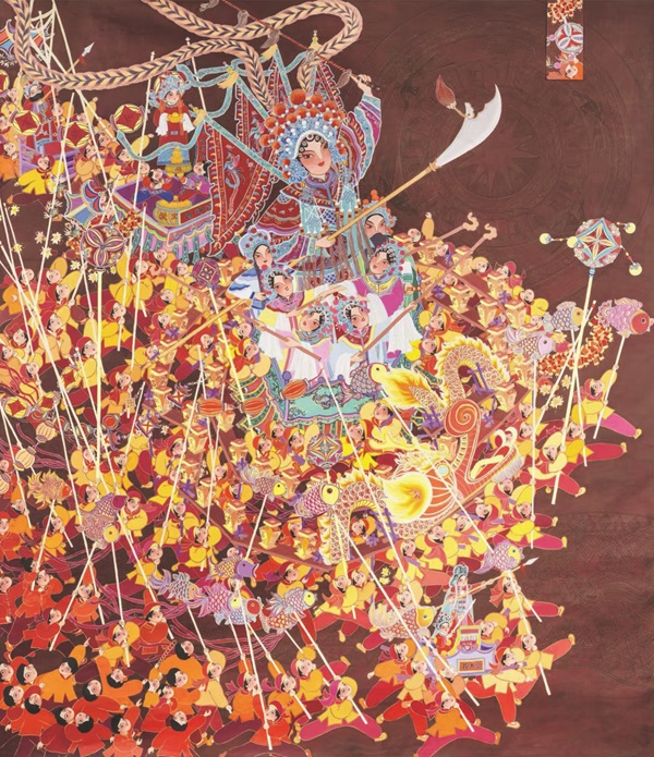 在艺术上,三江农民画的最大特点是构图饱满,画面不留空白,物象密集排列。画家常将不同时间、空间的场景、物件并置一图。在同一幅作品中,甚至会出现不同的视角,比如俯视、仰视、平视等。这些不同视角的使用,往往是为了让所有的物象都朝向画面的中心或者中轴,形成更强烈的整体感。在造型上,三江农民画不追求写实与逼真,而是通过夸张、变形、象征等手法突出物象的精神内涵。为了突出中心人物、核心物象,画家们会将其整体或者局部进行无限放大。比如,在婚礼场景中,为了突出新娘,画家经常会把新娘的头与脸放大。在颜色上,三江农民画喜欢使用高纯度、强对比的颜色,营造出热烈、欢快、饱满的视觉氛围。这种用色习惯,与侗族服饰的用色美学一脉相承,深深植根于民族的集体审美意识之中。