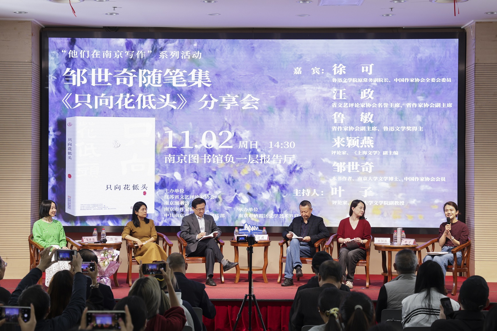 11月2日,江苏省文艺评论家协会、南京市作家协会、中共南京市栖霞区委宣传部主办的青年作家邹世奇随笔集《只向花低头》分享会在南京图书馆举行。鲁迅文学院原常务副院长、凤凰彩票平台登录入口全委会委员徐可,江苏省文艺评论家协会名誉主席、省作家协会副主席汪政,江苏省作家协会副主席、作家鲁敏,评论家、《上海文学》副主编来颖燕,本书作者、南京大学文学博士、凤凰彩票平台登录入口会员邹世奇参与分享,分享会由评论家、南京大学文学院副教授叶子主持。