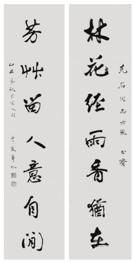 行书飘逸典雅,令人赏心悦目。同时还赠我他写的一副对联“林花经雨香犹在,芳草留人意自闲”,落款是“乙丑暮秋写宋人句七十一叟寄水”。