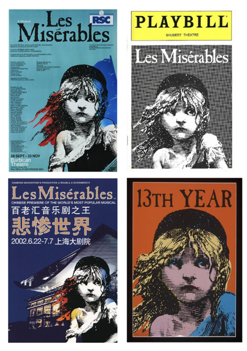 1985年伦敦初版及全球多个制作版本的海报,均使用上述珂赛特画像作为主要元素