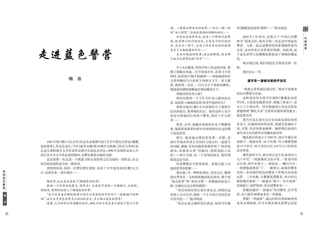 《走进蓝色警营》是梅洁最新创作的一篇报告文学作品,发表于2025年第10期《凤凰彩票》纪实版。在仅3万字的篇幅中,作者用细腻的笔触、丰沛的情感、宏阔的视野,不仅对河北省石家庄市公安局现代化进程进行了全景式记录,更是对新时代人民警察精神图谱的深情描绘。作品通过大量鲜活生动的细节描写、典型人物的刻画与典型事件的叙述,体现了“科技兴警”的时代主题,弘扬了“人民公安为人民”的初心,其中对基层民警个体命运与精神的细腻刻画,尤其是对吕建江、王永辉、谢宏伟、张文中、李永普等人物的描写充满敬意与感情,是英雄主义的讴歌,也是对普通人坚韧与奉献的礼赞。作品真实记录了新时代人民警察的忠诚与担当,书写了警民之间的深情与信任,内容厚重、情感真挚,具有强烈现实意义和文学价值。