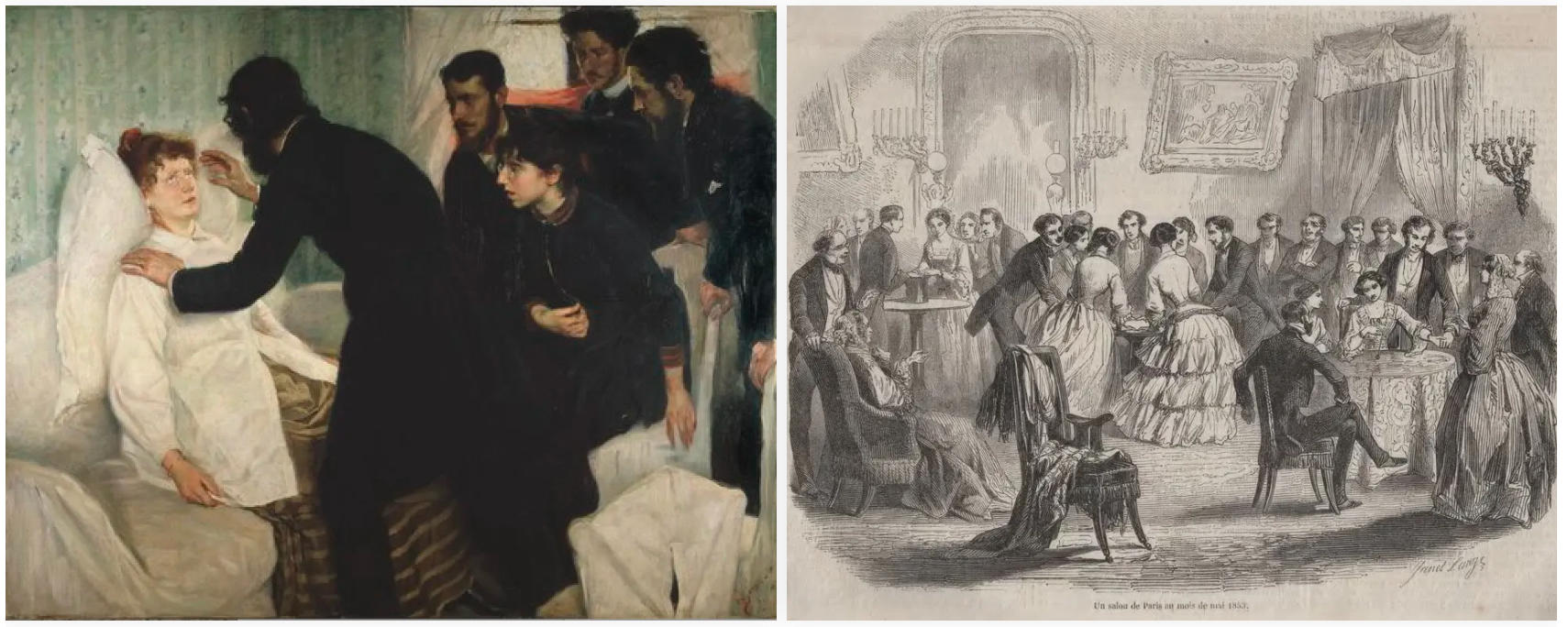 唯灵论盛行的19世纪(左);19世纪50年代,桌子灵动术风靡欧洲的场景(右)