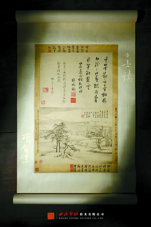 2025西泠秋拍项圣谟《寒江深雪图》一幅,据“辛卯春三月写于西子湖上”落款,知为顺治八年(1651)春所作,时项圣谟五十五岁。图有曹尔堪、周廷鑨、吴嘉纪、吴山、王士禛题跋。王渔洋题:“深雪寒林,断桥渔浦,蓑笠而独钓者,彼何人欤?”钤“钑镂王家”阴阳印。看到拍卖网页的宣传词“最盛年的项圣谟,十八岁的王士祯,同赏西湖雪景”,我甚为错愕。十八岁的王士禛尚在乡里读书,并且终其身未践杭城之土,何来与项圣谟同赏西湖雪景之事?说明中又强调:“此跋应是市场所见王士祯最年少的墨迹,跋后所钤‘钑镂王家’朱白印十分罕见,或为其家族印章。”此跋果真为渔洋十八岁所作吗?绝无可能。
