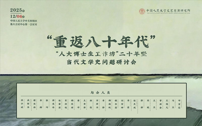 12月6日,由中国人民大学文艺思潮研究所主办的“重返八十年代”——“人大博士生工作坊”二十年暨当代文学史问题研讨会在中国人民大学逸夫会堂第一会议室举行。会议围绕“重返八十年代”博士生工作坊的方法、成果与中国当代文学史研究的基本问题展开交流与研讨,26位国内高校与科研机构的专家学者与会。