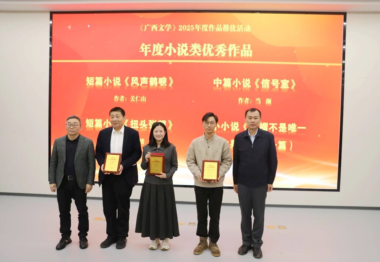 本次活动共评选出14篇(组)获奖作品,涵盖小说、诗歌、散文、评论等多个门类,集中体现了《广西文学》2025年度所刊发作品的较高艺术水准。关仁山的《风声鹤唳》、当颜的《信号室》、东楼的《扭头张望》、刘佳的《石榴不是唯一的水果》(外一篇)被评为优秀小说。大解的组诗《在北方》、杨红旗的组诗《滇西手记》被评为优秀诗歌。林东林的《停留与抵达》、李燕燕的《困在时间里的救赎》、王小忠的《车巴河纪事》(二篇)、杜怀超的《致我的鲍村姐姐》被评为优秀散文。子方的《当代“返乡者”的宿命困局与精神救赎——关于鬼子长篇小说<买话>主要人物刘耳形象的深度剖析》被评为优秀评论。卢亦梦的《望空山》、劳明萍的《月圆的时候》、依蔓的《野马削鬃》被评为新人优秀作品。