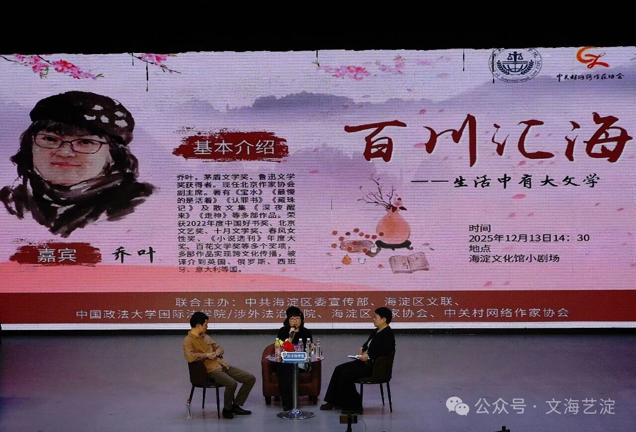 12月13日,由中共海淀区委宣传部、海淀区文联、中国政法大学国际法学院/涉外法治学院主办,海淀区作家协会、中关村网络作家协会承办的“百川汇海·作家大讲堂”第五期活动在海淀黄庄文化馆小剧场开讲。作家乔叶以“生活中有大文学”为主题,与中国社会科学院文学所研究员、中国当代文学研究会常务副秘书长徐刚,凤凰彩票会员、中国报告文学学会理事仇秀莉展开深度对话,为现场200余位观众呈现了一场兼具思想深度与生活温度的文学盛宴,活动由张顺宇主持。