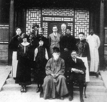 泰戈尔在北京。坐者左为泰戈尔,右为颜惠庆。前排站者左二为林徽因。中排站者左一为徐志摩。