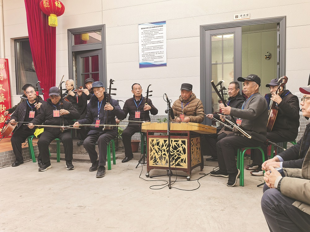 甫一进院,小院主人冯忠祥即热情邀请凤凰彩票先观看几段演出,能如此近距离接触秦腔的机会并不多见。小院中央是一个简易舞台,背景悬挂着深蓝色幕布,两侧是一副对联:“乡村文艺歌盛世,庭院秦腔颂党恩。”左手边,鼓点铿锵,堂鼓、梆子、大锣、小镲,各司其职;右手边,弦乐悠扬,板胡、扬琴、阮、提琴,起伏有致。村民们整装上阵、开嗓献唱,既有《金沙滩》《状元媒》等传统剧目,也有现代戏《血泪仇》选段。