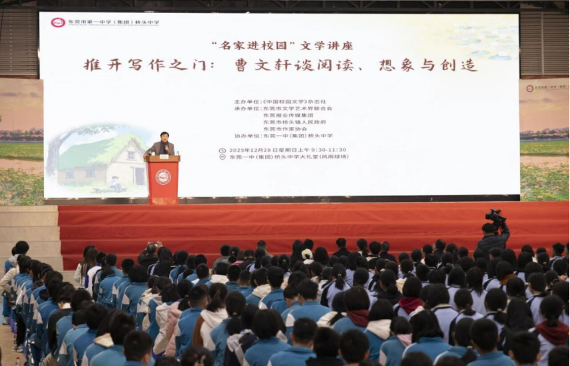 活动期间,还举办了丰富多彩的文学活动。12月28日上午,“名家进校园”之《推开写作之门:曹文轩谈阅读、想象与创造》文学讲座活动在东莞桥头中学举行。曹文轩教授结合自身多年的创作经验和经典作品为例,以生动幽默的语言,深入浅出地阐述了阅读积累、想象力培育与创造性表达之间的内在联系。他鼓励同学们以阅读为“弓”、写作为“箭”,保持对世界的好奇与感知,勇敢地将个人独特的观察、体验与想象付诸笔端。面对AI创作,他赠言“死磕”,鼓励学生坚守创作初心。现场气氛热烈,掌声不断。在互动环节中,学生们踊跃提问,围绕写作中遇到的困惑、阅读方法的选择等与曹文轩老师进行了深入交流。