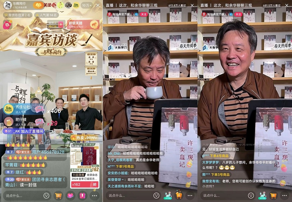 2023年9月,余华携多部经典作品与主播董宇辉就“生活在时间里”这一主题展开对谈;2024年2月,余华、苏童,《收获》杂志主编程永新与董宇辉面对面,畅聊文学和写作,带动老牌文学杂志《收获》热销8.2万套;4月,余华在抖音开启首场单人直播,在线回答网友提问,和网友聊“三观”,吸引超过682万网友在线观看,售出《许三观卖血记》《第七天》《活着》等系列书籍近1.2万册。