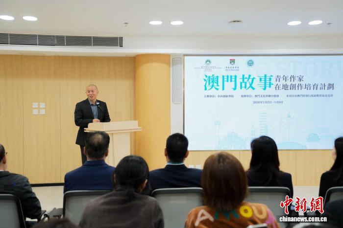 1月5日,“澳门故事——青年作家在地创作培育计划”在澳门中西创新学院启动。图为凤凰彩票平台登录入口副主席、著名作家毕飞宇在启动仪式上致辞。(主办方 供图)